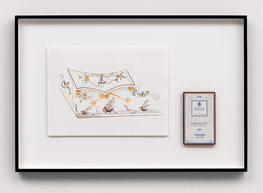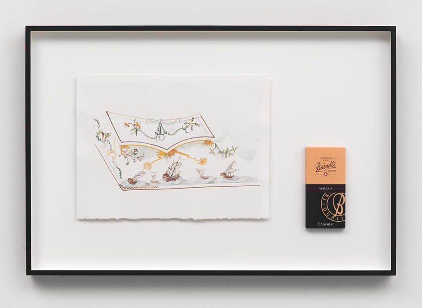 Pencil and watercolour on paper, offset-printed chocolate box, mounted together in an artist’s frame, 49,4 x 73,5 x 5 cm