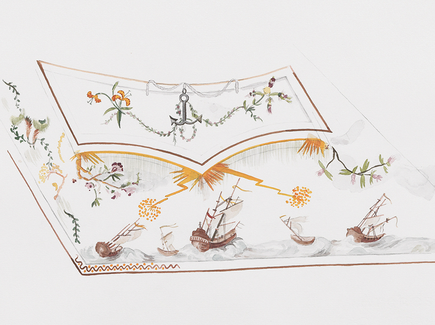 With the redrawn recurring motif of a ship in a storm, the group of three similar works draws attention to European logistics for supply chains from the colonies. Perhaps the cocoa traders in the Spanish colony of Venezuela wore such finely embroidered vests, boasting about the profit margins in the confectionery industry?